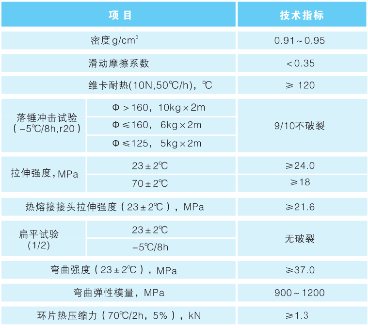 韌性好,具有優良的抗地層沉降及抗震性能。常用管材分為普通型和加強型。普通型適用于開挖鋪設施工和非開挖穿越施工埋深小于4米的工程;加強型用于非開挖穿越施工埋深大于4米的工程。